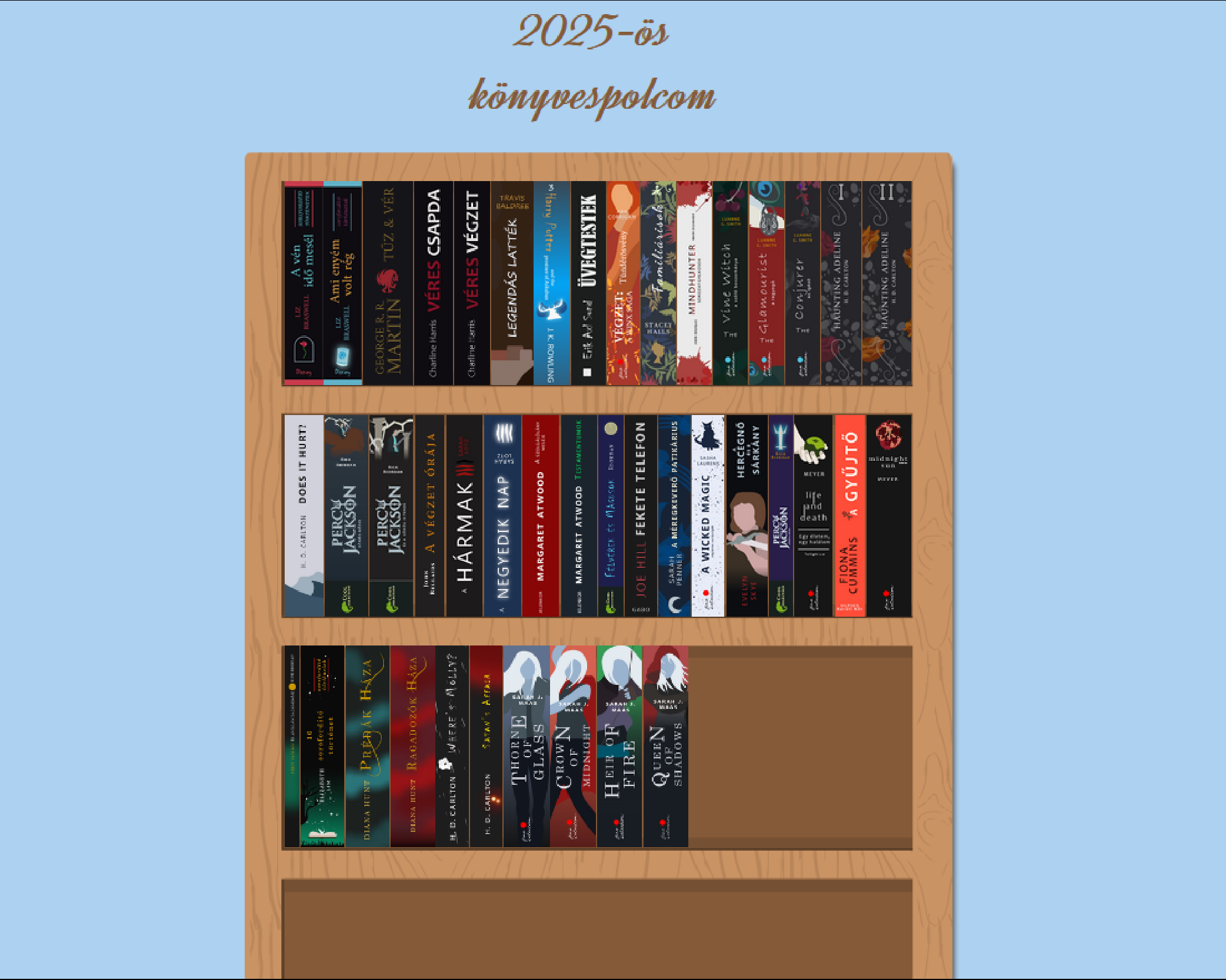 A 2025-ös könyvespolcom egy igazi szerelemprojekt. Az olvasás a legfőbb hobbim. Előfordul persze, hogy olyan könyv kerül a kezembe, ami nem nyeri el a tetszésemet – ilyenkor megválok tőle. Ugyanakkor mindig jó érzés visszanézni, mely könyveket olvastam az adott évben, ezért úgy döntöttem, készítek egy online könyvespolcot, ahol nemcsak a könyveket gyűjthetem, hanem a róluk írt véleményeimet is.